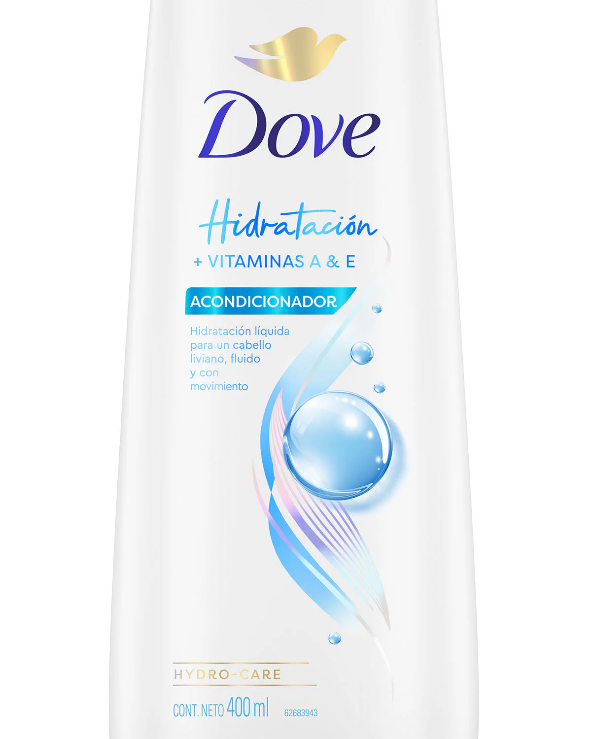 Dove Hidratación: Dove Hidratación + Vitaminas A&E ; Hidratación liviana para un pelo liviano, fluido y con movimiento.