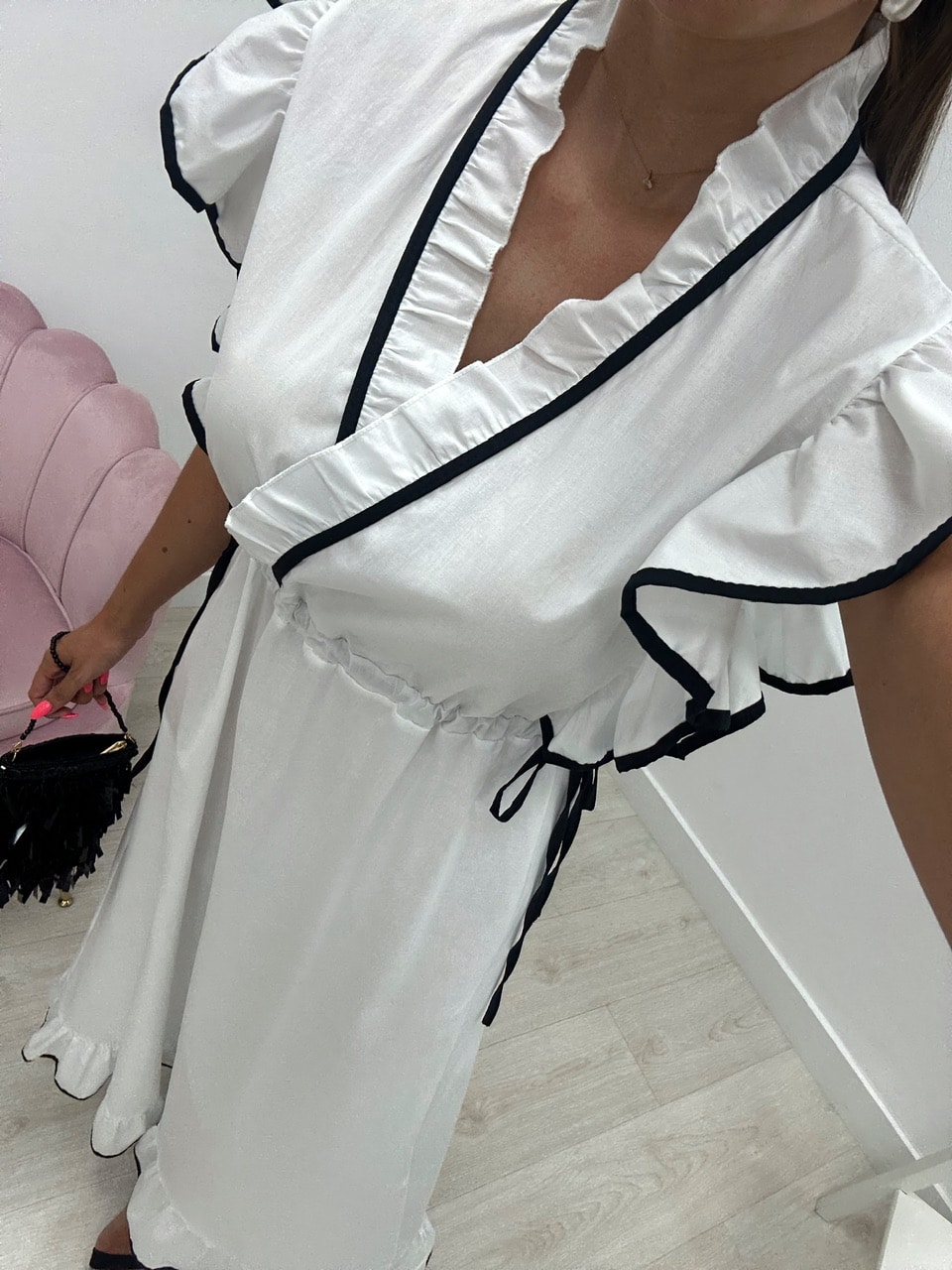 Tejido popelin. Lleva lazadas ajustables en ambos lados.